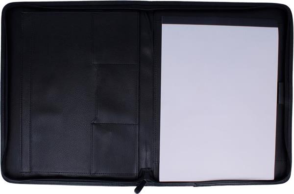 Teczka konferencyjna A4 z okładką z klejonej skóry. Zapinana na zamek błyskawiczny. Notatnik zawiera 25 czystych kartek, 4 wewnętrzne przegródki, uchwyt na długopis.