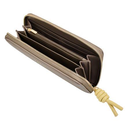 Portfel Apolline w kolorze taupe jest wykonany z miękkiej, matowej, wysokiej jakości skóry wegańskiej (PU) i ma eleganckie złote wykończenia dla wyrafinowanego wykończenia. Sygnowany złotym logo TPU z przodu, portfel ten łączy luksus z praktycznością. Zabawny żółty suwak w kształcie węzła dodaje zabawnego akcentu do klasycznego projektu portfela. Miękki, kolorowy i zabawny portfel Apolline doskonale uzupełnia kolekcję toreb Apolline.