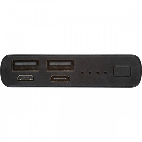 Power bank z aluminium pochodzącego z recyklingu, o pojemności 10 000 mAh, z wyświetlaczem LCD i kabelkiem do ładowania. Power bank posiada 2 porty USB i wejście typu C.