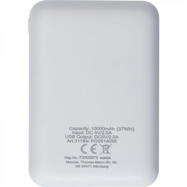 Plastikowy (ABS) power bank o pojemności 10000mAh. Wyposażony w kabel i wyświetlacz, a także 2 wejścia USB do jednoczesnego ładowania 2 urządzeń. Dane techniczne: Output: DC 5V 2000MA (max) Input: DC 5V 2000MA (max) Pojemność: 10000mAh (2 x 5000mAh), Safetyprotection Inne: Dołączony kabelek ze złączami USB A i mikro USB