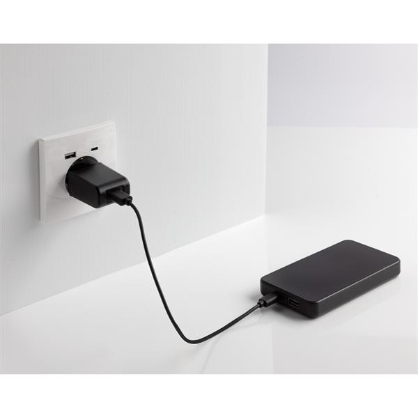 Power bank 10000 mAh z portem wejścia/wyjścia USB typu C i dodatkowym portem USB typu A, obudowa wykonana jest z tworzywa ABS pochodzącego z recyklingu z certyfikatem RCS. RCS (Recycled Claim Standard) to standard weryfikacji zawartości surowców wtórnych w produkcie w całym łańcuchu dostaw, wskaźniki zasilania wskazują pozostały poziom energii, w zestawie kabel ładujący TPE z recyklingu z certyfikatem RCS