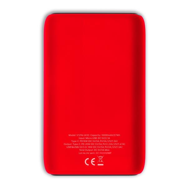 Power bank 10000 mAh, 4 diody wskazujące poziom naładowania, gumowana obudowa, wejście micro USB oraz USB-C (18W), 2 wyjścia USB (18W), wyjście USB-C (20W), możliwość ładowania trzech urządzeń jednocześnie, kabel USB-C w komplecie