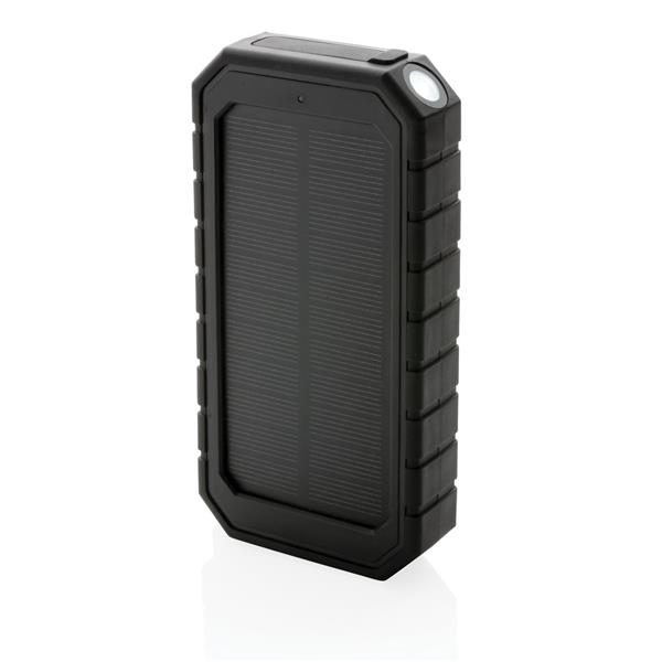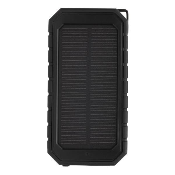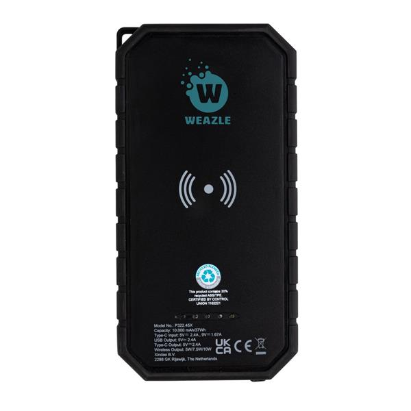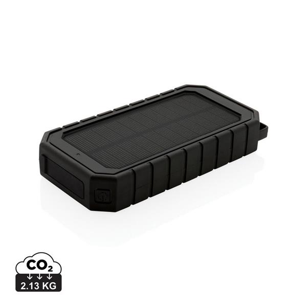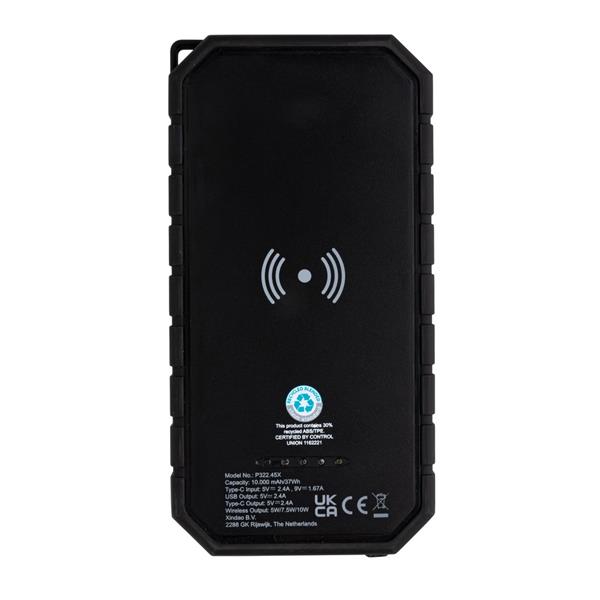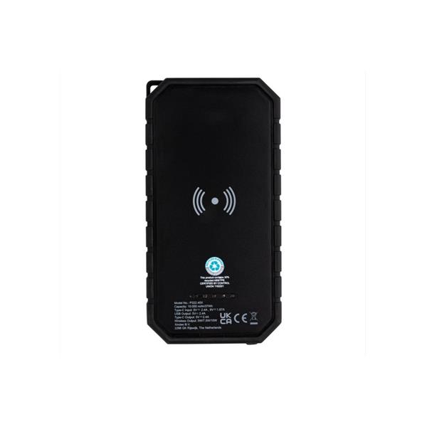 Bezprzewodowy power bank 10000 mAh ze zintegrowanym panelem słonecznym, ładowarka bezprzewodowa 10W, lampka, karabińczyk, wykonany z ABS i TPE z recyklingu, całkowita zawartość materiałów z recyklingu obliczona na podstawie wagi całkowitej produktu: 30%, wodoodporny IPX5, diody wskazujące poziom naładowania, działa z telefonami posiadającymi możliwość ładowania indukcyjnego, wyjście USB 5V/2.4A, wyjście USB typu C 5V/2.4A, kabel USB typu C z TPE z recyklingu w komplecie, nie zawiera PVC, ślad węglowy produktu: 2,13 kg CO2