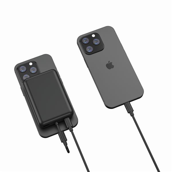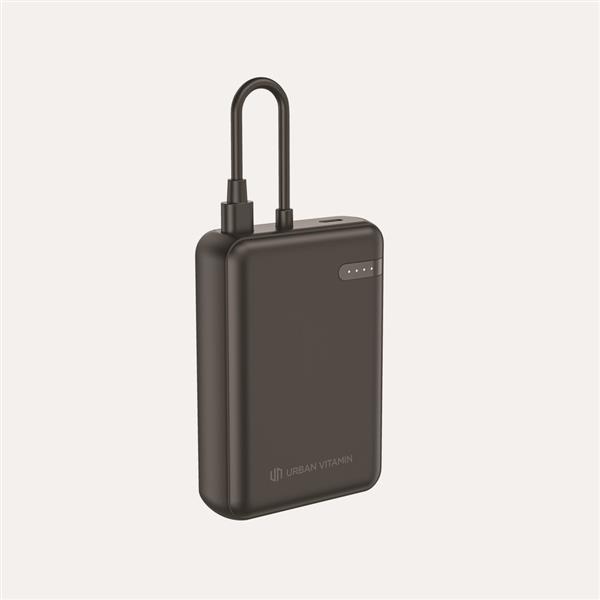 Power bank 10000 mAh, szybkie ładowanie PD do 20W, możliwość jednoczesnego ładowania dwóch urządzeń, port USB-C oraz wbudowany kabel USB-C, szybkie ładowanie samego power banku, wykonany z recyklingowanego ABS i PC z certyfikatem RCS, zawartość materiałów z recyklingu: 20%, opakowanie ograniczające użycie plastiku, wolny od PVC