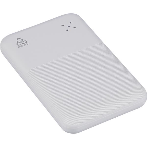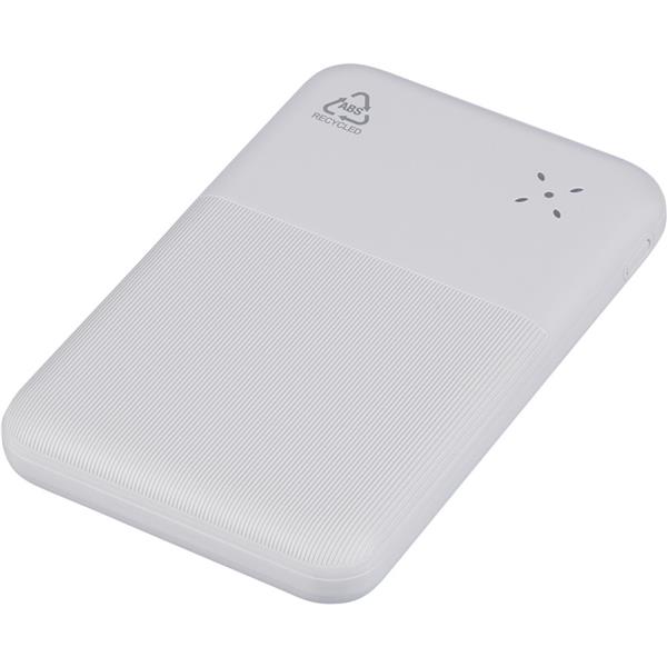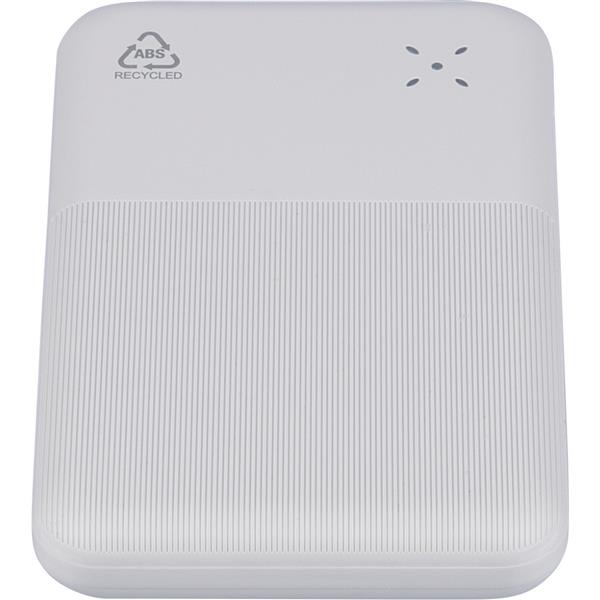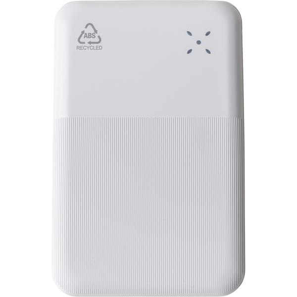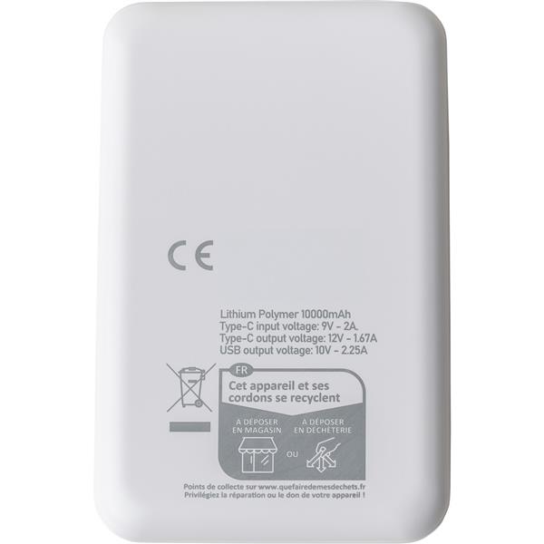 Power bank o mocy 22,5W i pojemności 10000 mAh z baterią litowo-jonową, wejście i wyjście typu C, wejście typu A, etykieta informacyjna z tyłu, ikona RABS na produkcie, posiada zabezpieczenie przed przegrzaniem, zwarciem, przepięciem i przeciążeniem, zapakowany pojedynczo w brązowe kartonowe pudełko, produkt wykonany z ABS z recyklingu