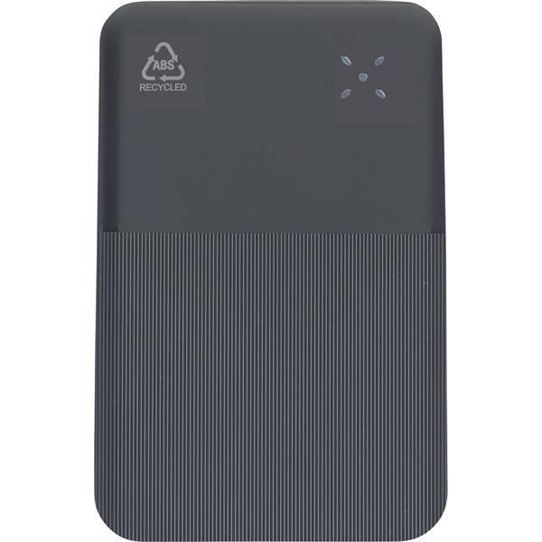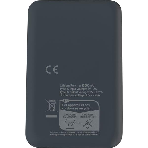 Power bank o mocy 22,5W i pojemności 10000 mAh z baterią litowo-jonową, wejście i wyjście typu C, wejście typu A, etykieta informacyjna z tyłu, ikona RABS na produkcie, posiada zabezpieczenie przed przegrzaniem, zwarciem, przepięciem i przeciążeniem, zapakowany pojedynczo w brązowe kartonowe pudełko, produkt wykonany z ABS z recyklingu