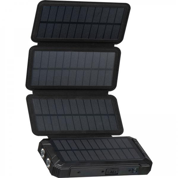 Power bank słoneczny o pojemności 20 000 mAh i czterema rozkładanymi panelami słonecznymi zapewniającymi wydajny pobór energii słonecznej . Dane techniczne: Pojemność: 20000 mAh Micro Input: DC 5V, 2A Output 1: DC 5V, 3A Type-C output: DC 5V, 3A Type-C input: DC 5V, 2A Output 2: DC 5V, 2A Moc ładowania bezprzewodowego: 5W Inne: Dostepne wejścia: USB A, typ C, mikro USB Dostępne kabelki: lighting, typ C, mikro USB, USB Kabelek do ładowania: USB A i typ C