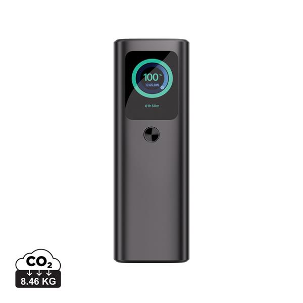 Power bank 20000 mAh, zintegrowany kabel USB-C, posiada kolorowy wyświetlacz TFT pokazujący poziom naładowania, prędkość ładowania, ilość cykli ładowania, stoper, moc ładowania do 165W, trzy porty wyjściowe, 2 x USB-C i USB-A, wykonany z aluminium z recyklingu