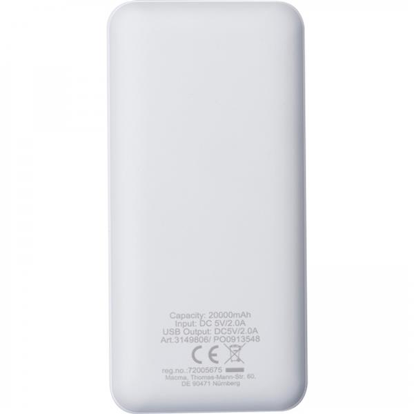 Power bank z plastiku (ABS) o mocy 20 000 mAh z cyfrowym wskaźnikiem ładowania. Dwa porty USB umożliwiają jednoczesne ładowanie dwóch urządzeń. Kabelek w zestawie. Dane techniczne: Wyświetlacz cyfrowy. Output: USB A x2 Input: Mikro USB, Typ C Input: DC 5V 2A (max.) Output: DC 5V 2A Capacity: 20000 mAh (2 x 10000 mAh) Inne: Dołączony kabelek ze złączami USBA i typ C Kabel około 30 cm