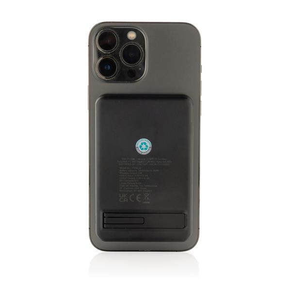 Ładowarka bezprzewodowa 3 w 1, bezprzewodowy, magnetyczny power bank 5000 mAh 5W, stacja dokująca do ładowania power banku, ładowarka bezprzewodowa 5W do słuchawek i drobnych akcesoriów, ładowarka bezprzewodowa 2,5W do smartwatchy (tylko iOS), wykonana z ABS z recyklingu z certyfikatem RCS, działa z telefonami posiadającymi możliwość ładowania indukcyjnego, wejście 5V/2.4A, wyjścia: 5V/1A, 5V/1A, 5V/0.5A, kabel 120 cm z TPE z recyklingu w komplecie, całkowita zawartość materiałów z recyklingu obliczona w oparciu o wagę całkowitą przedmiotu: 59%, w pudełku z certyfikatem FSC® mix
