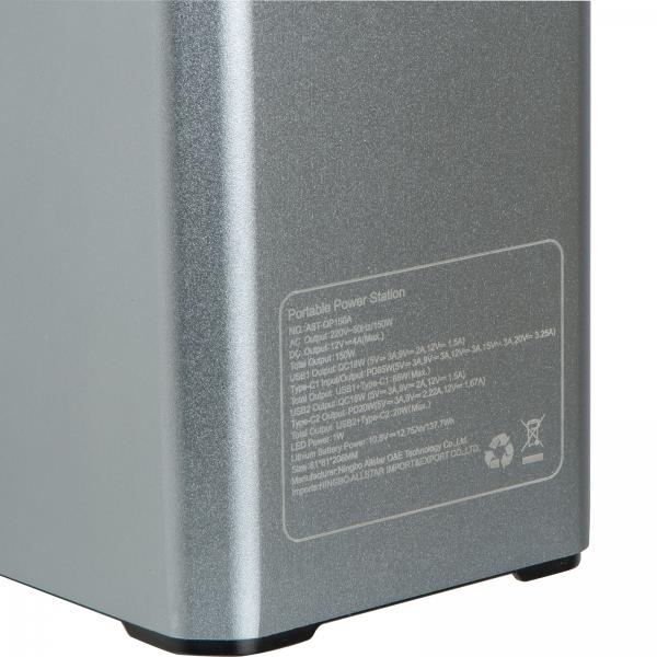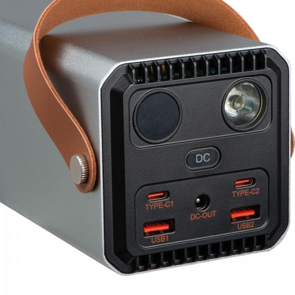 Power bank wykonany z aluminium, o pojemności 39 000 mAh. Moc wyjściowa max. 150W, wejście i wyjście USB oraz typ C.Dane techniczne:DC-OUT (5521) Output: 12V 4.0A (Max.) Type-C1 Input/Output: PD65W USB1 Output: QC18W Type-C2 Output: PD20W USB2 Output: QC18W USB1+Type-C1 Total Output: 65W (Max.) USB2+Type-C2 Total Output: 20W (Max.) AC Output: 220V/50Hz, 150W (Max.) LED Torch: 1W Pojemność: 10.8V/12.75Ah/137,7Wh (38250 mAh). ??Inne:Produkt zapakowany w solidny karton, zabezpieczony pianką wewnątrz. Zestaw zawiera wtyczkę z typem złącza C. Input: 100-240VAC, 50-60Hz, 1A, Output USB-C: PD 3.0 (max. 20W) 5V/3A (max. 15W), 9V/2A (max. 18W), 12V/1.67A (max. 20W) oraz kabel wyposażony w podwójne złącze typu C