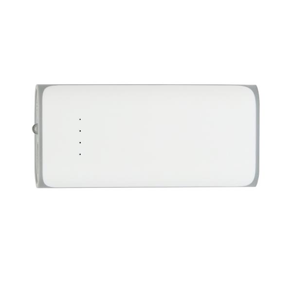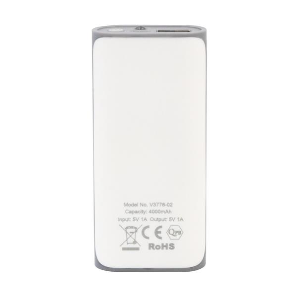 Power bank 4000 mAh, wyjście 5V/1A, wejście 5V/1A, 4 diody wskazujące poziom naładowania, lampka LED, w komplecie kabel micro USB