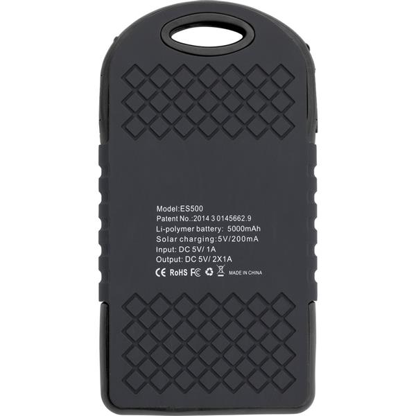 Power bank 4000 mAh, ładowarka słoneczna 5V/200 mA, gumowane wykończenie, zielone diody wskazujące poziom naładowania, lampka z boku, 2 porty USB oraz 1 port micro USB, wejście DC 5V/1A, wyjście DC 5V/2x1A, kabel USB w komplecie
