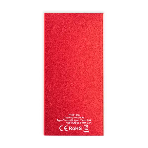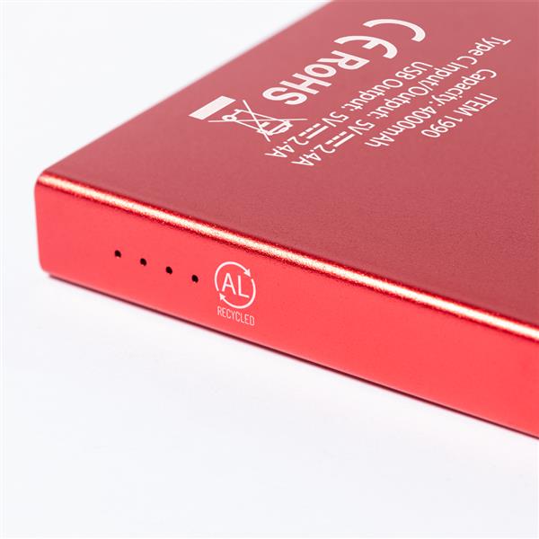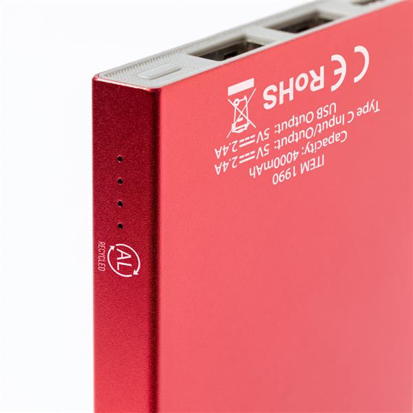 Power bank 4000 mAh wykonany z aluminium z recyklingu, 4 diody wskazujące poziom naładowania, wejście/wyjście USB typu C 5V/2.4A, 2 wyjścia USB 5V/2.4A, kabel USB typu C w komplecie