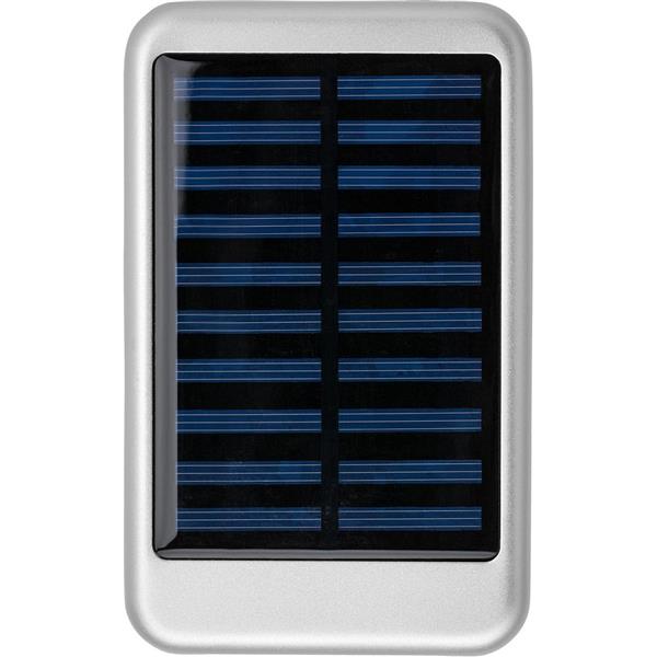 Power bank 4000 mAh, ładowarka słoneczna, niebieskie diody wskazujące poziom naładowania, porty USB i USB-C, wejście DC5V/1A, wyjście 5V/1A kabel USB w komplecie, produkt wykonany z ABS