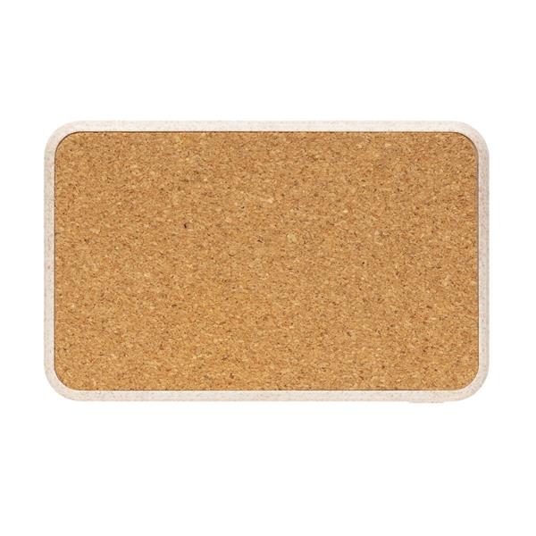 Power bank 5000 mAh, 4 diody wskazujące poziom naładowania, górna część wykonana z naturalnego korka, obudowa z mieszanki 35% słomy pszenicznej i ABS, wbudowany akumulator litowo-polimerowy klasy A o dużej gęstości i trwałości pozwala na naładowanie telefonu do 3 razy, wejście USB typu C 5V/2A, wejście micro USB 5V/2A, wyjście 5V/2A, nie zawiera PVC, ślad węglowy produktu: 1,96 kg CO2
