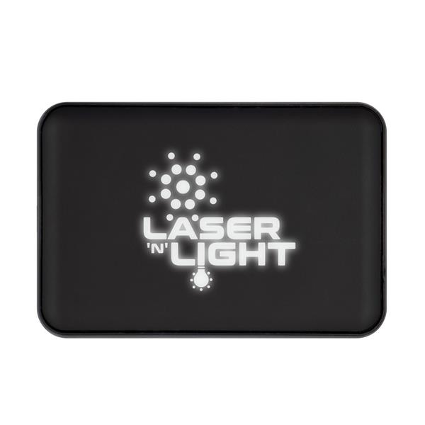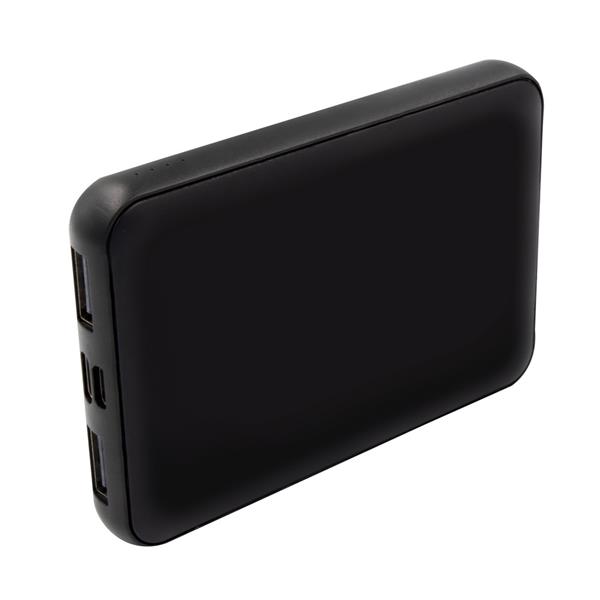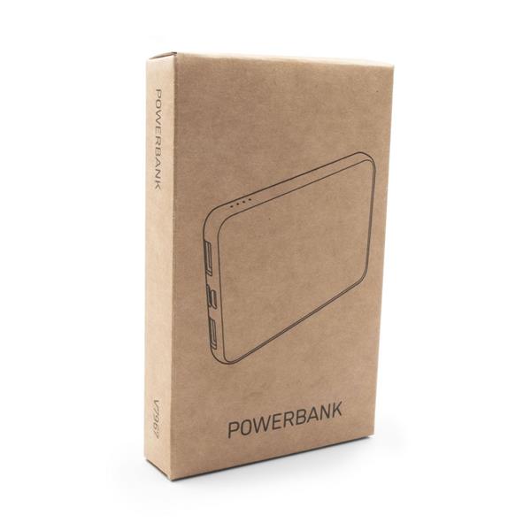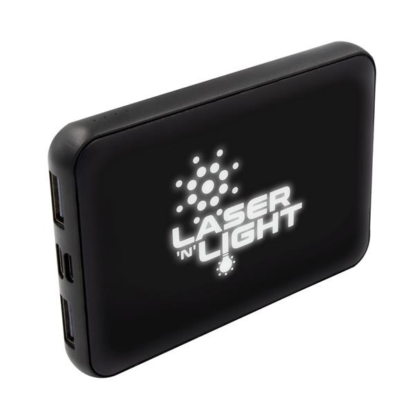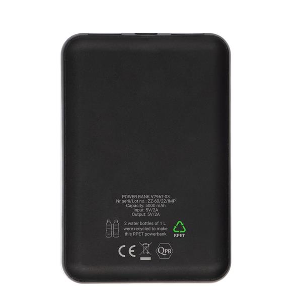 Power bank 5000 mAh wykonany z RPET, grawer ukazuje podświetlaną powierzchnię, 4 diody wskazujące poziom naładowania, 2 wyjścia USB (5V/2A), 2 wejścia (5V/2A): micro USB oraz USB-C, kabel micro USB w komplecie