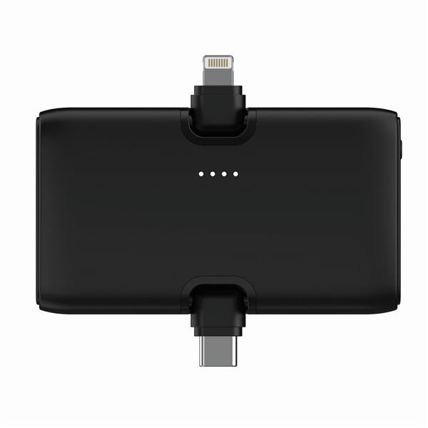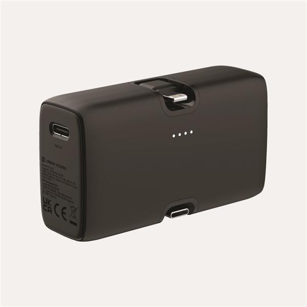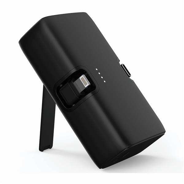 Power bank 5000 mAh, szybkie ładowanie do 20W, zintegrowane wyjścia USB-C i iOS, stojak na telefon, wyjście USB-C, wykonana z ABS z recyklingu, całkowita zawartość materiałów z recyklingu obliczona na podstawie wagi całkowitej produktu: 24%