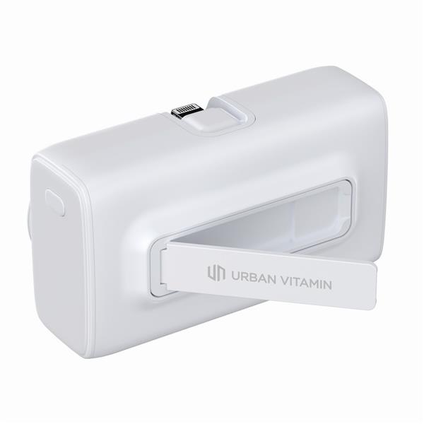 Power bank 5000 mAh, zintegrowana ładowarka bezprzewodowa do zegarka (tylko iOS), szybkie ładowanie do 20W, zintegrowane wyjścia USB-C i iOS, stojak na telefon, wyjście USB-C, działa z urządzeniami posiadającymi możliwość ładowania indukcyjnego, wykonana z ABS z recyklingu, całkowita zawartość materiałów z recyklingu obliczona na podstawie wagi całkowitej produktu: 24%