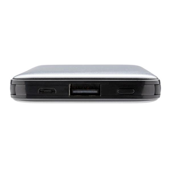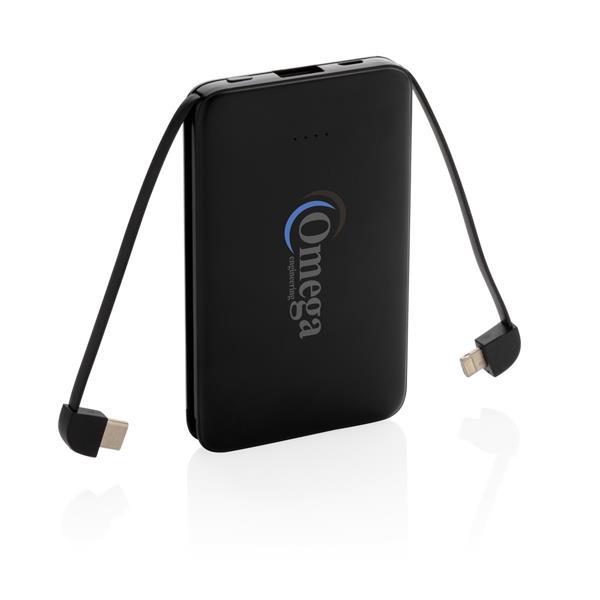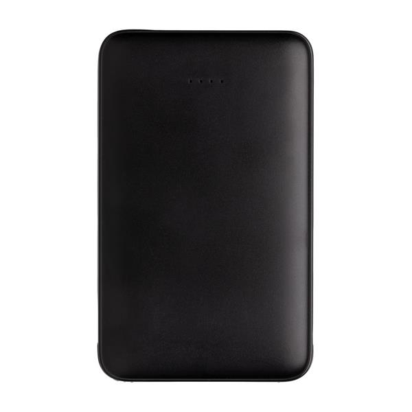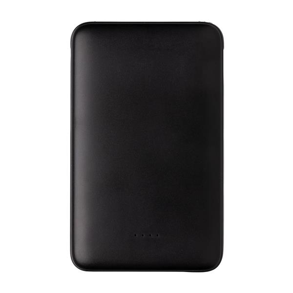 Power bank 5000 mAh, zintegrowany kabel 3 w 1 z TPE, kompatybilny z większością urządzeń dostępnych na rynku, kieszonkowy rozmiar, wykonany z ABS, wskaźniki poziomu naładowania, wbudowany akumulator litowo-polimerowy klasy A o dużej gęstości i trwałości pozwala naładować telefon do 2 razy, wejście 5V/2A, wyjście 5V/2A, ślad węglowy produktu: 1,99 kg CO2