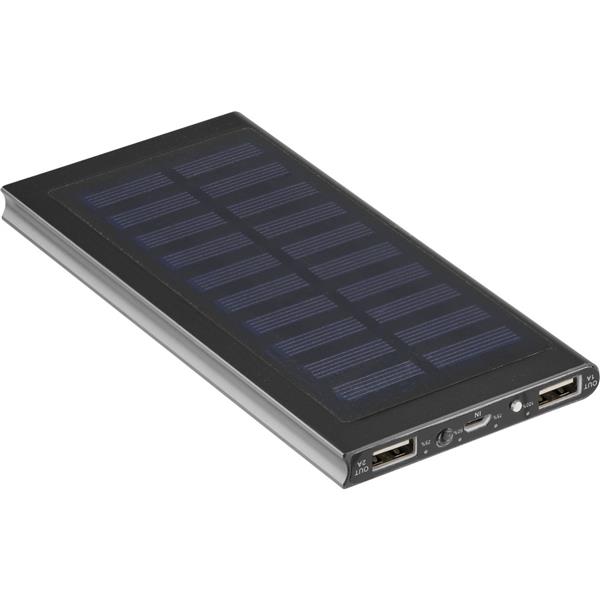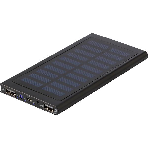 Power bank 8000 mAh, ładowarka słoneczna, diody wskazujące poziom naładowania, 2 wyjścia USB do ładowania 2 urządzeń jednocześnie, wyjście USB1 DC 5V/1A, wyjście USB2 DC 5V/2.1A, wejście 5V/1A, kabel micro USB w komplecie