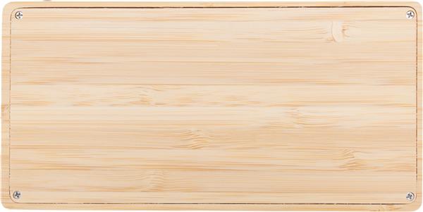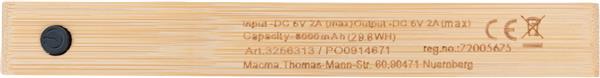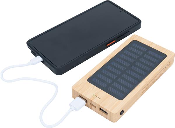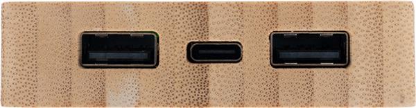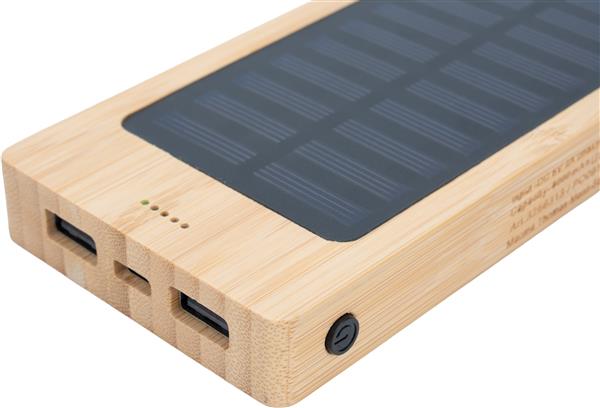 Power bank solarny o pojemności 8000 mAh w bambusowej obudowie. Kabel ładujący jest dołączony do zestawu. Dane techniczne: Output: 5.2V, 2000 mAh (max.) Input: 5V, 2000 mAh (max.) Pojemność: 8000 mAh Wejścia/wyjścia: 2x USB A, type C Inne: Dołączony kabelek ze złączami USB A i typ C