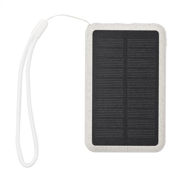Power bank USB w ekologicznej obudowie z tworzywa sztucznego ze słomy pszenicznej z wbudowaną ładowarką solarną i baterią 5000 mAh. Z 2 portami ładowania USB i 1 portem USB-C. Port wejściowy USB-C.