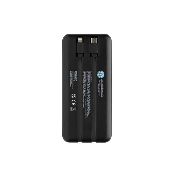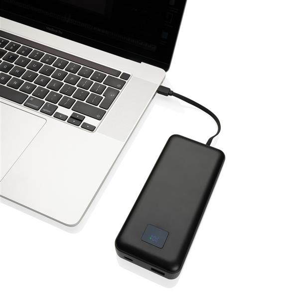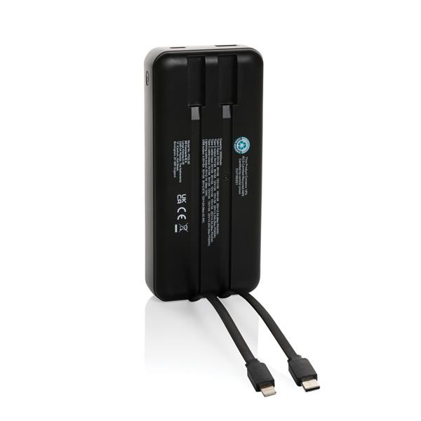 Power bank do laptopa 20000 mAh, moc ładowania przewodowego do 65W, która wystarczy do naładowania laptopa, zintegrowane kable USB C i iOS, wyświetlacz LED, wykonany z ABS z recyklingu z certyfikatem RCS, całkowita zawartość materiałów obliczona na podstawie wagi całkowitej przedmiotu: 23%, ślad węglowy produktu: 7,58 kg CO2