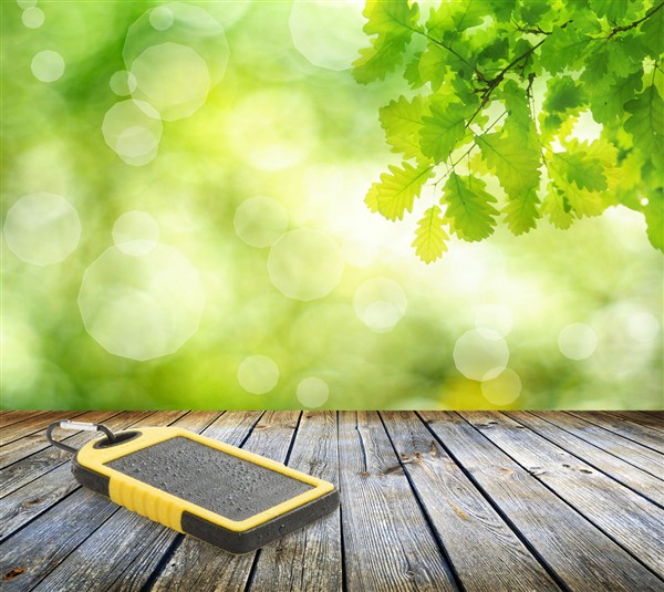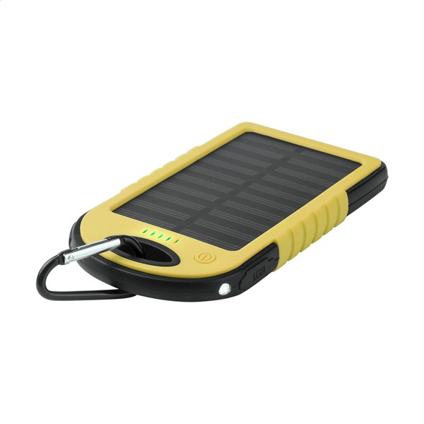 Pokryty silikonem power bank o pojemności 4000mAh, ładowarką solarną i latarką z 1 diodą LED. Kabel ładujący w zestawie.