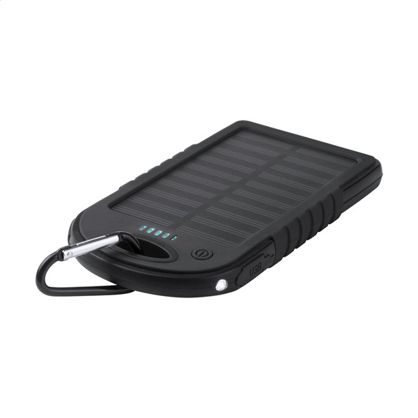 Pokryty silikonem power bank o pojemności 4000mAh, ładowarką solarną i latarką z 1 diodą LED. Kabel ładujący w zestawie.
