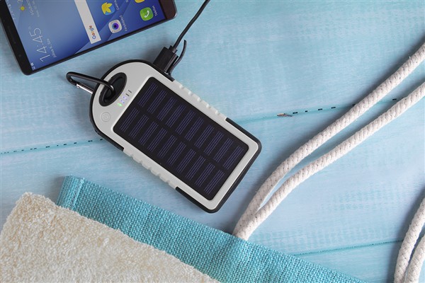 Pokryty silikonem power bank o pojemności 4000mAh, ładowarką solarną i latarką z 1 diodą LED. Kabel ładujący w zestawie.