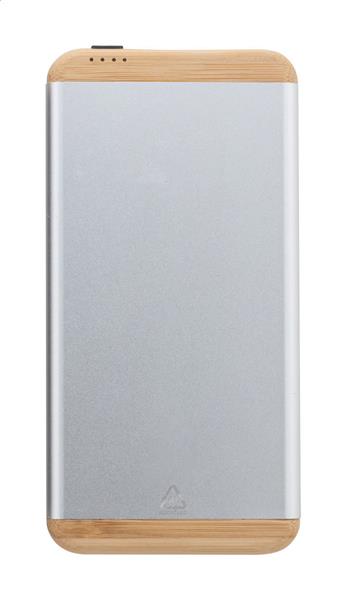 Power bank z aluminium z recyklingu i bambusa z baterią 5000 mAh. Z 1 portem ładowania USB i 1 portem ładowania USB-C. Port wejściowy USB-C. W zestawie kabel do ładowania USB.