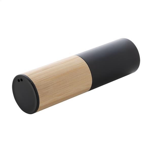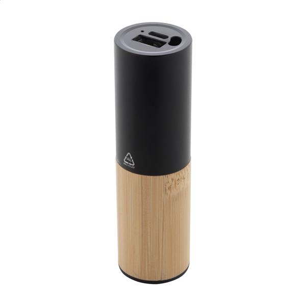 Power bank z aluminium z recyklingu i bambusa z baterią 2600 mAh. Z 1 portem ładowania USB i 1 portem ładowania USB-C. Port wejściowy USB-C. W zestawie kabel do ładowania USB.