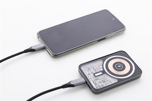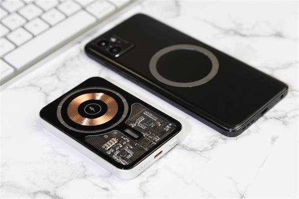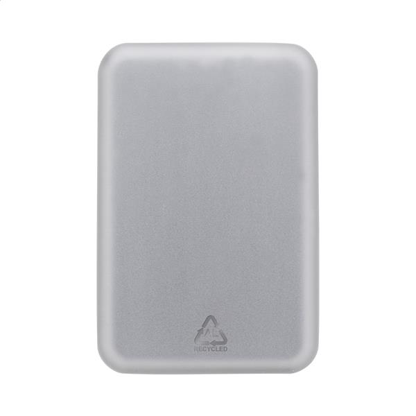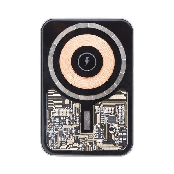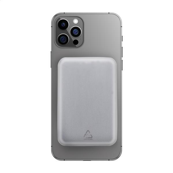 Power bank z aluminium z recyklingu z półprzezroczystą obudową i widocznymi komponentami elektronicznymi. Z baterią 5000 mAh i wbudowaną magnetyczną szybką ładowarką bezprzewodową (15 W). Z wejściem USB-C i portem ładowania. Zawiera samoprzylepny metalowy pierścień do korzystania z funkcji magnetycznej na dowolnym urządzeniu z możliwością ładowania bezprzewodowego. Zgodny z iPhone® 12 lub nowszym. Zawiera kabel do ładowania USB.