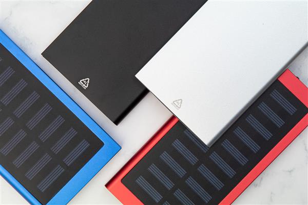 Powerbank USB w aluminiowej obudowie z recyklingu o pojemności 4000 mAh z wbudowanym panelem solarnym. Z 2 portami USB i 1 portem USB-C do ładowania. Port wejściowy USB-C. Zawiera kabel USB.
