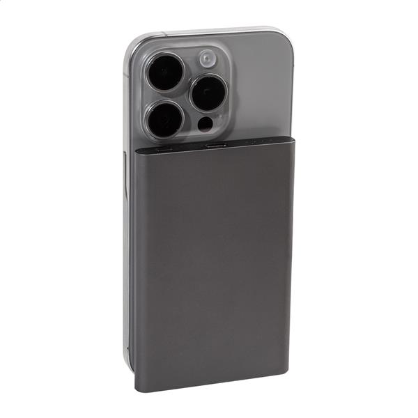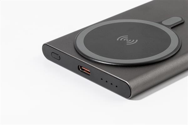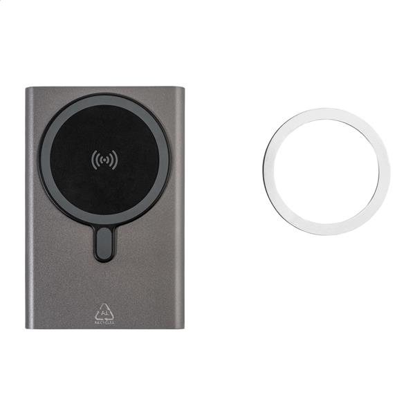 Power bank z aluminium pochodzącego z recyklingu z wbudowaną szybką ładowarką indukcyjną, magnetyczną (15 W) i baterią 5000 mAh. Z wejściem USB-C i portem ładowarki. Zawiera samoprzylepny metalowy pierścień umożliwiający wykorzystanie funkcji magnetycznej na dowolnym urządzeniu ładowanym bezprzewodowo. Kompatybilny z iPhonem® 12 lub nowszym. Zawiera kabel USB.