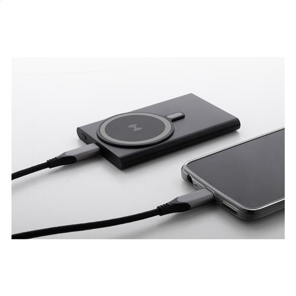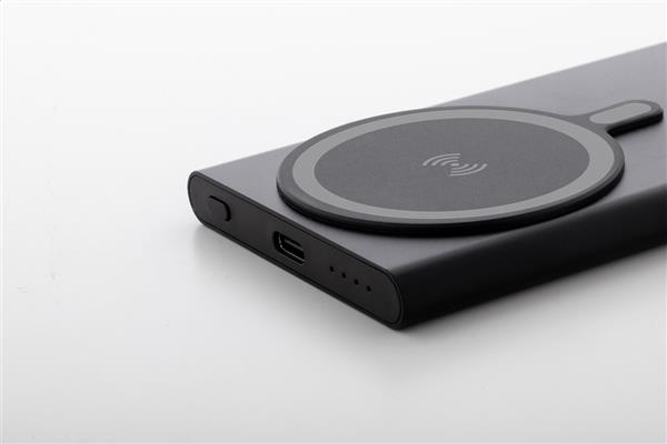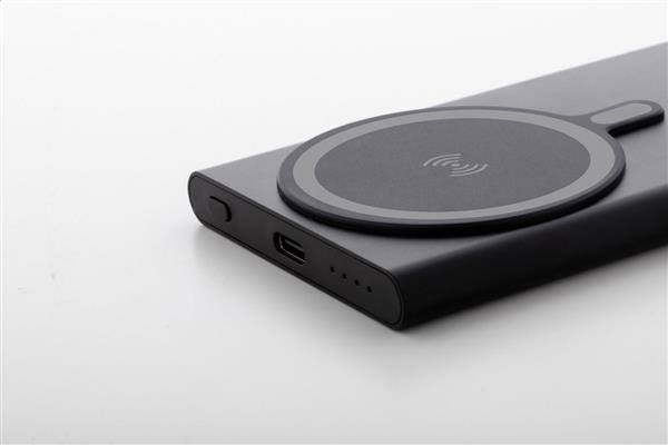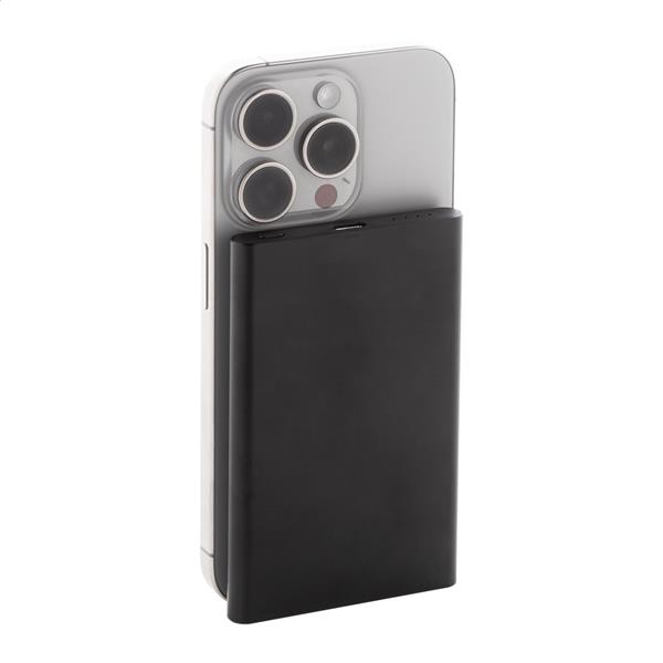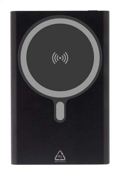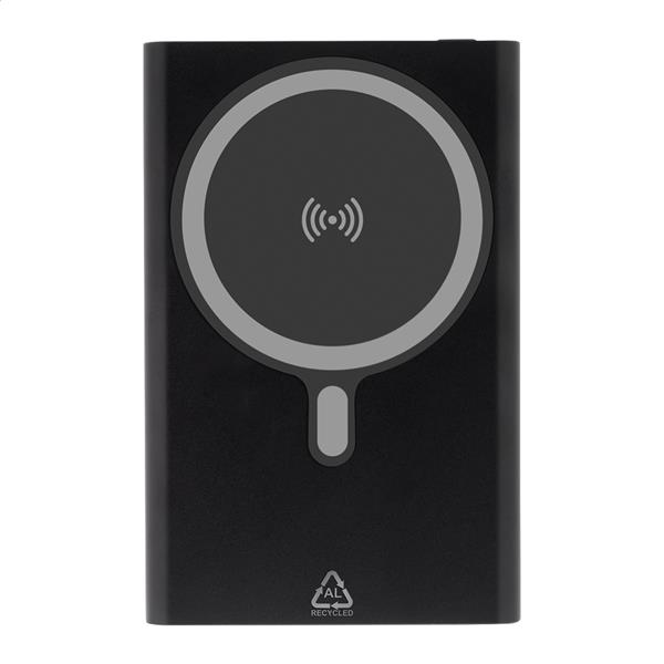 Power bank z aluminium pochodzącego z recyklingu z wbudowaną szybką ładowarką indukcyjną, magnetyczną (15 W) i baterią 5000 mAh. Z wejściem USB-C i portem ładowarki. Zawiera samoprzylepny metalowy pierścień umożliwiający wykorzystanie funkcji magnetycznej na dowolnym urządzeniu ładowanym bezprzewodowo. Kompatybilny z iPhonem® 12 lub nowszym. Zawiera kabel USB.