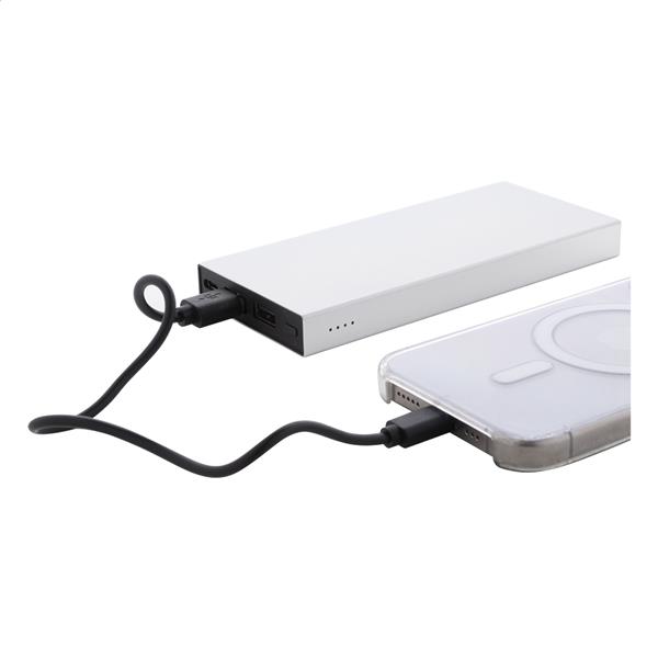 Power bank z aluminium pozyskanego z recyklingu z baterią 10000 mAh. Z 2 portami ładowania USB i 1 portem ładowania USB-C. Port wejściowy USB-C. Zawiera kabel USB.