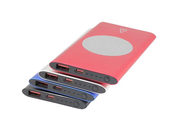 Powerbank USB z aluminium pochodzącego z recyklingu, z wbudowaną szybką ładowarką indukcyjną (15W) i baterią 4000 mAh. Z 1 portem USB i 1 portem USB-C do ładowania. Port wejściowy USB-C. W zestawie kabel do ładowarki USB.