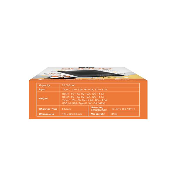 QS58 to wydajny power bank o pojemności 20,000 mAh, wyposażony w baterię o wysokiej gęstości, która jest 30% mniejsza i 25% lżejsza niż standardowe baterie o podobnej pojemności. Dzięki temu urządzenie jest niezwykle kompaktowe i łatwe do przenoszenia. Zastosowanie technologii 20W Power Delivery pozwala na naładowanie urządzeń, takich jak iPhone 14, do 50% w zaledwie 30 minut. Dodatkowo, dwa porty USB z funkcją szybkiego ładowania 18W QC3.0 umożliwiają jednoczesne podłączenie kilku urządzeń, co zapewnia pełną wygodę podczas codziennego użytkowania.