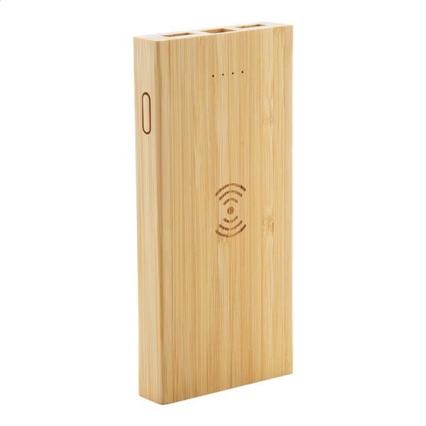 Bambusowy power bank 6000 mAh z ładowarką indukcyjną (5W). Porty wejściowe: mico USB i USB-C. Zawiera kabel USB.