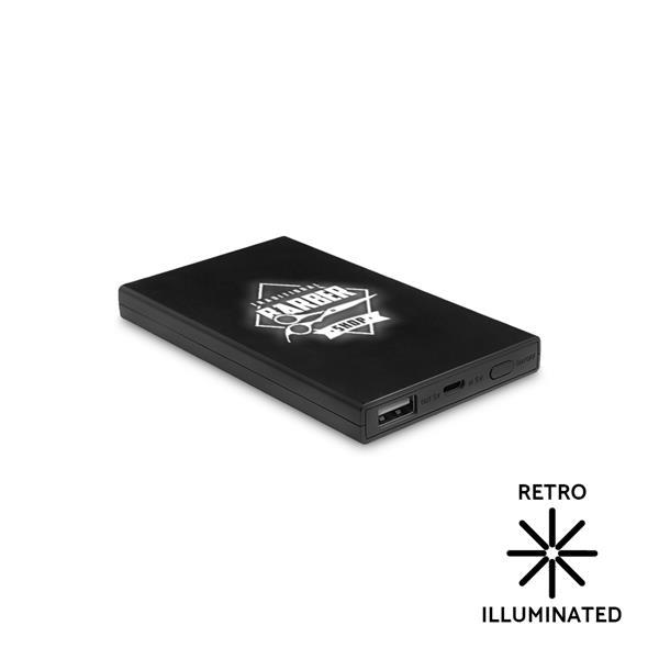 Aluminiowy power bank o pojemności 4000 mAh, z logotypem podświetlanym po wygrawerowaniu. Posiada kable USB i micro-USB, pudełko prezentowe dołączone. Kolor: Czarny L2 (grawer laserowy): 5 x 4 cm Rozmiar: 7 x 11,8 x 0,6 cm
