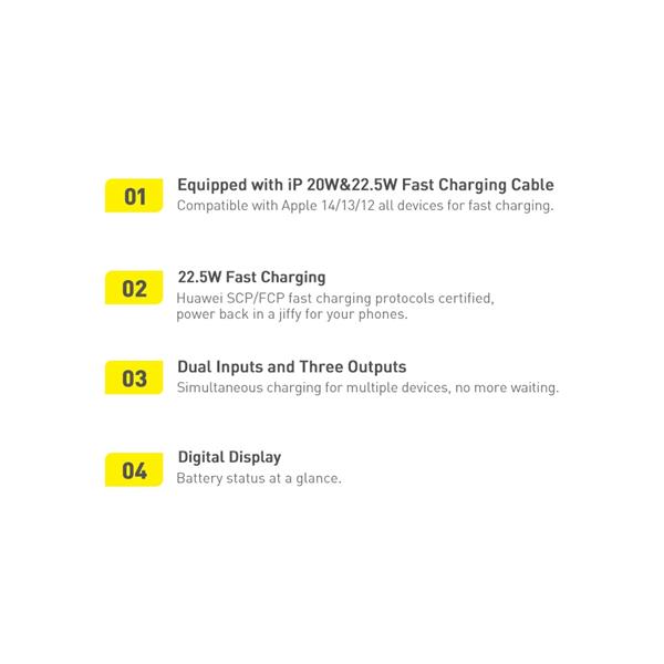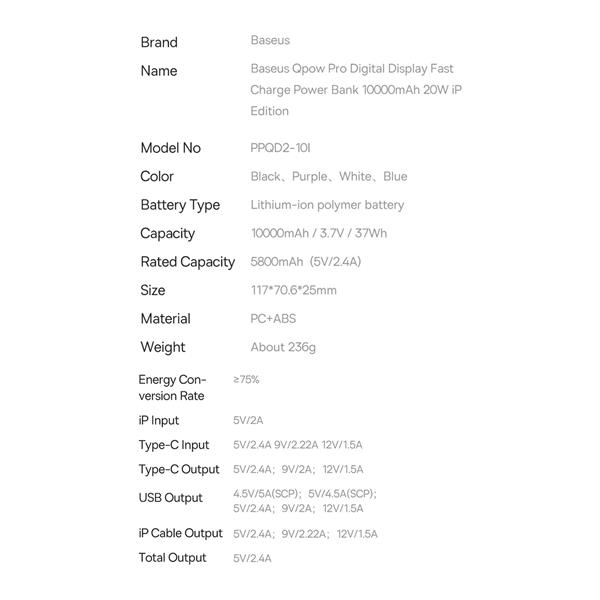 Posiadasz wiele urządzeń, z których korzystasz na co dzień? Podróżujesz lub jesteś poza stałym źródłem zasilania? Powerbank Qpow Pro marki Baseus to rozwiązanie idealne dla Ciebie. Urządzenie ma nie tylko ciekawe i eleganckie wykończenie, ale charakteryzuje się bardzo dobrymi parametrami. Produkt wyposażono w 3 różne rodzaje złącz jak USB-A, USB-C oraz Lightning. Dzięki temu można ładować jednocześnie kilka urządzeń z łączną mocą 20W. W zestawie dołączony jest kabel zasilający USB C 3A 0.3m.