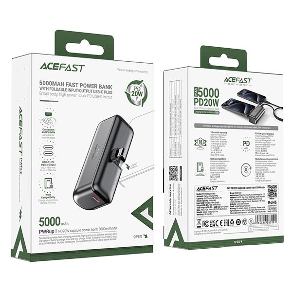 Powerbank Acefast M9 5000 mAh został zaprojektowany z myślą o mobilności i wygodzie. Jego miniaturowy rozmiar i lekka konstrukcja sprawiają, że jest łatwy do noszenia, idealny do codziennego użytku. Składana wtyczka USB-C to dodatkowy atut, który ułatwia przechowywanie i transport urządzenia, nie powodując wypukłości w torbie czy kieszeni. Przeszedł testy wytrzymałościowe na 10 000 złożeń, co gwarantuje jego niezawodność i długowieczność.