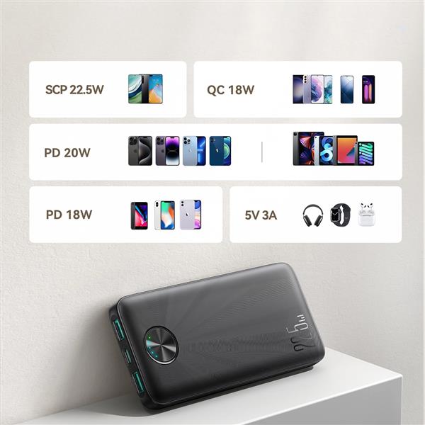 Powerbank Joyroom JR-PBF15 umożliwia ładowanie trzech urządzeń naraz. Dzięki portom USB-A i USB-C możesz zasilać swoje smartfony, tablety i słuchawki jednocześnie, bez potrzeby wybierania, które urządzenie ma pierwszeństwo. Port USB-A 2 o mocy do 22.5W, USB-C o mocy do 18W oraz USB-A 1 o mocy do 22.5W gwarantują szybkie i efektywne ładowanie, niezależnie od urządzenia.