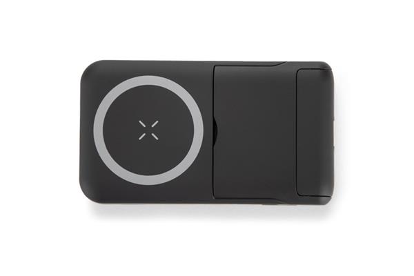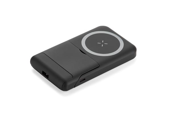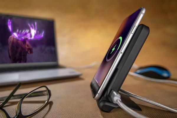 Power bank NUBLIS o pojemności 10 000 mAh to wielofunkcyjny gadżet, który łączy w sobie nowoczesne technologie i atrakcyjny design. Obsługuje szybkie ładowanie przewodowe i bezprzewodowe w standardzie Qi Wireless, a dzięki portom USB-C i USB-A umożliwia jednoczesne zasilanie kilku urządzeń. Wskaźnik w formie diod LED pozwala w prosty sposób kontrolować poziom naładowania baterii. Power bank wyposażono także w funkcję stojaka, dzięki czemu telefon można wygodnie ustawić pionowo podczas ładowania. Dzięki magnetycznemu mocowaniu idealnie współpracuje z telefonami wyposażonymi w funkcję MagSafe. Dużym atutem jest podświetlane logo (light up logo), które pozostaje widoczne także w trakcie ładowania, nadając urządzeniu wyjątkowy charakter reklamowy. NUBLIS to praktyczny gadżet z możliwością znakowania, który świetnie sprawdzi się jako prestiżowy upominek firmowy.