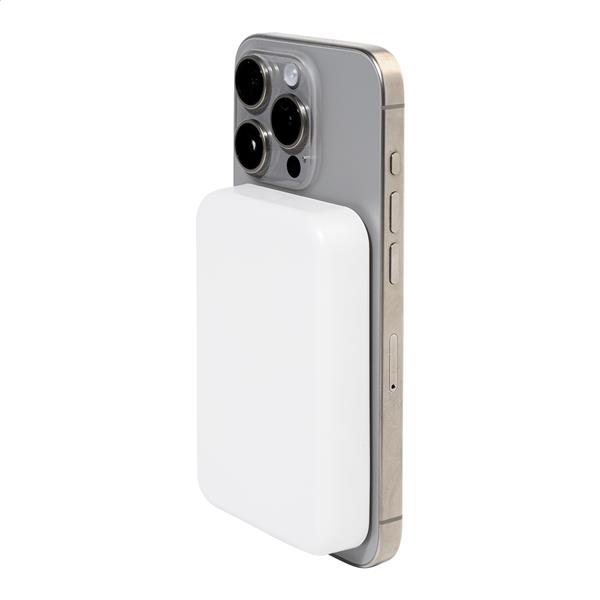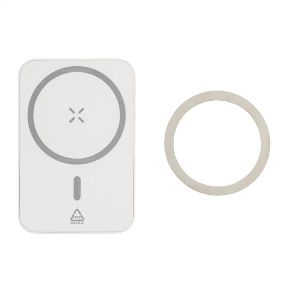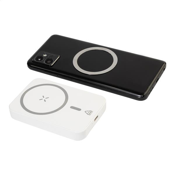 Powerbank z recyklingowanego ABS z baterią 5000 mAh i wbudowaną magnetyczną szybką ładowarką bezprzewodową (15 W). Z wejściem USB-C i portem ładowania. W zestawie samoprzylepny metalowy pierścień do korzystania z funkcji magnetycznej na dowolnym urządzeniu z funkcją ładowania bezprzewodowego. Kompatybilny z iPhone® 12 i nowszymi. W zestawie kabel USB do ładowania.