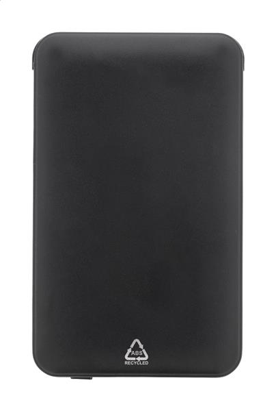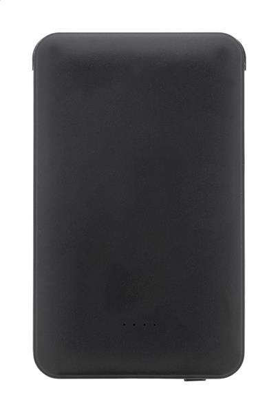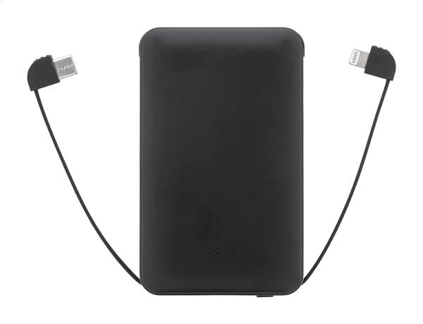 Powerbank z recyklingowanego ABS o pojemności 5000 mAh i zintegrowanymi kablami ładującymi ze złączami micro USB, USB-C i Lightning. Z portem ładowania USB i wejściem USB-C. W zestawie kabel ładujący USB.