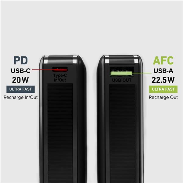 Dzięki technologii Adaptive Fast Charge powerbank automatycznie dostosowuje moc do ładowanego urządzenia, zapewniając bezpieczeństwo baterii i optymalną efektywność ładowania.