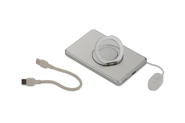Power bank ZYNTRA o pojemności 5000 mAh i mocy 20 W to kompaktowe urządzenie łączące kilka nowoczesnych funkcji. Obsługuje szybkie ładowanie przewodowe i bezprzewodowe, w tym także indukcyjne ładowanie zegarka. Dzięki technologii MagSafe stabilnie utrzymuje telefon, a wbudowany stojak pełni jednocześnie funkcję uchwytu, ułatwiając korzystanie z urządzenia w trakcie ładowania. Wyposażony w port USB-C, umożliwia szybkie zasilanie różnych modeli smartfonów. Dodatkowym atutem jest praktyczna smycz zintegrowana z przewodem USB-C – USB-C, która ułatwia przenoszenie i pozwala ładować urządzenia w dowolnym miejscu. ZYNTRA to wielofunkcyjny gadżet reklamowy z możliwością znakowania, który doskonale sprawdzi się w pracy i podróży.